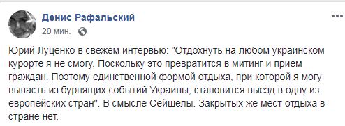 Реакция соцсетей не заставила себя ждать. "... Поэтому единственной формой отдыха, при которой я могу выпасть из бурлящих событий Украины, становится выезд в одну из европейских стран". В смысле Сейшелы. Закрытых же мест отдыха в стране нет", - иронизирует журналист Денис Рафальский над словами генпрокурора на своей странице в Facebook.