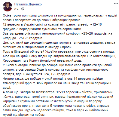 "В четверг также еще будет сухо, а вот 14 сентября подойдет атмосферный фронт, который принесет на наши запад и зевер периодические дожди", - пишет Наталья Диденко.