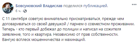 Журналист Владислав Бовсуновский заявил, что с 11 сентября советует внимательно присматриваться, прежде чем договариваться со своей девушкой/парнем о совместном проживании. "Теперь - кто первый добежал до полиции и написал на сожителя заявление, того и квартира. Независимо от прав собственности. Вангую всплеск мошенничества и махинаций", - написал он.