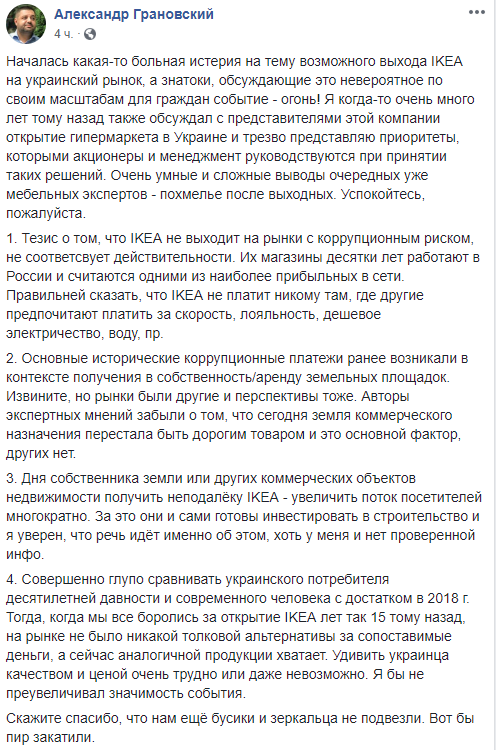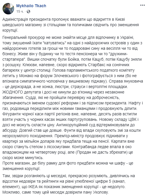 Журналист Михаил Ткач, который ведет антикоррупционные расследования, пишет, что ИКЕА не является показателем победы над взятками.