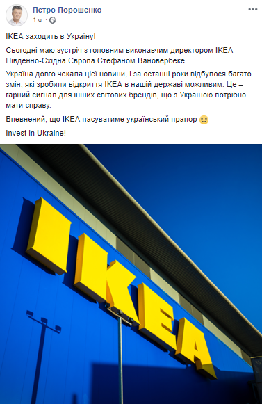 "Украина долго ждала этой новости, и за последние годы произошло много изменений, которые сделали открытие IKEA в нашем государстве возможным. Это - хороший сигнал для других мировых брендов, с Украиной нужно иметь дело", - говорится на странице Петра Порошенко.