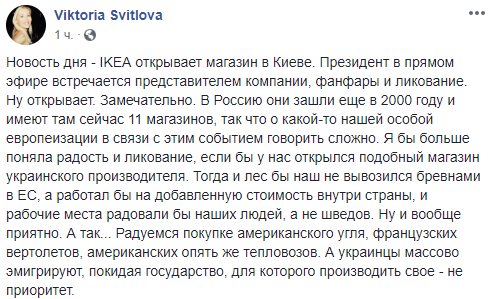 "Новость дня - IKEA открывает магазин в Киеве. Президент в прямом эфире встречается представителем компании, фанфары и ликование. Ну открывает. Замечательно. В Россию они зашли еще в 2000 году и имеют там сейчас 11 магазинов, так что о какой-то нашей особой европеизации в связи с этим событием говорить сложно. Я бы больше поняла радость и ликование, если бы у нас открылся подобный магазин украинского производителя. Тогда и лес бы наш не вывозился бревнами в ЕС, а работал бы на добавленную стоимость внутри страны, и рабочие места радовали бы наших людей, а не шведов. Ну и вообще приятно. А так... Радуемся покупке американского угля, французских вертолетов, американских опять же тепловозов. А украинцы массово эмигрируют, покидая государство, для которого производить свое - не приоритет", - пишет журналистка Виктория Светлова.