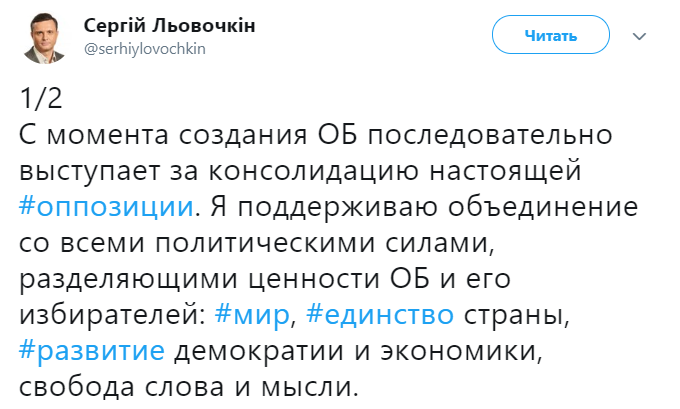 "С момента создания ОБ последовательно выступает за консолидацию настоящей оппозиции. Я поддерживаю объединение со всеми политическими силами, разделяющими ценности ОБ и его избирателей: мир, единство страны, развитие демократии и экономики, свобода слова и мысли. Среди таких сил вижу и "За життя" Рабиновича и Мураева. В трудное для страны время нужно отбросить амбиции и прекратить конфликты-только объединив все оппозиционные силы, мы вернем в Украину мир, стабильность, развитие, создадим условия для украинцев снова жить по-человечески", - написал политик в Twitter.