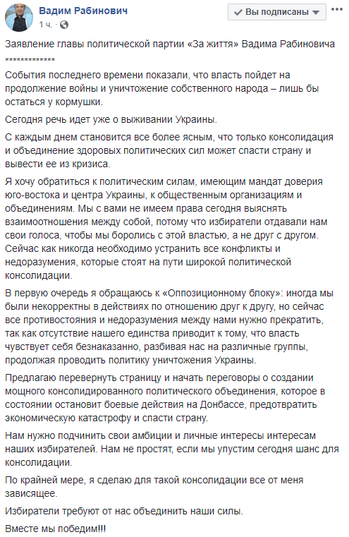 Первым заявление сделал лидер партии "За життя" Вадим Рабинович.