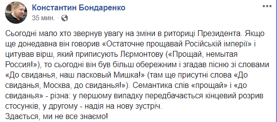 "Сегодня мало кто обратил внимание на изменения в риторике президента. Если еще недавно он говорил "Окончательное прощай Российской империи" и цитировал стихотворение, которое приписывают Лермонтову ( "Прощай, немытая Россия!"), то сегодня он был более осторожным и вспомнил песню со словами "До свиданья, наш ласковый Мишка" (там еще присутствуют слова "До свиданья, Москва,