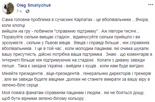вышли на игру - увидели "настоящую поддержку". Целых полутора тысяч... Посчитайте, сколько вмещает стадион, отминусуйте сколько пришло и вы поймете, сколько во Львове овец. Овец и действительно больше, чем настоящих болельщиков. И это в то время, когда молодым пацанам, которые глазами искали ваше присутствие, действительно нужна ваша поддержка. Знаю, что комментариев в интернете больше, чем поддерживающих на стадионе. Копать с дивана всегда легче. Такова западная Украина - выйдем из кустов, когда нам будет выгодно", - написал он.