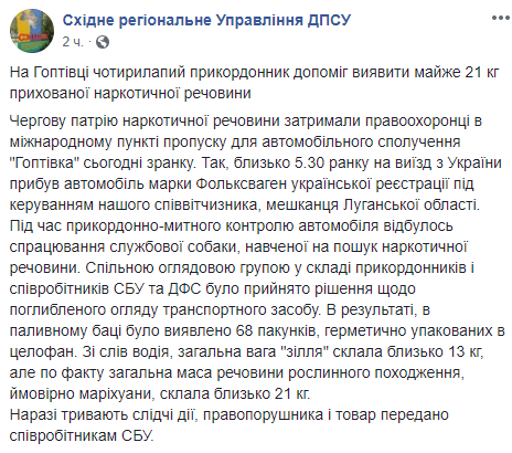 Служебный пес разоблачил украинца, который вез в Россию 21 кг марихуаны