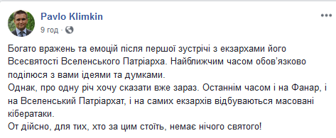"В последнее время и на Фанар, и на Вселенский патриархат, и на самих экзархов происходят массированные кибератаки. Вот действительно, для тех, кто за этим стоит, нет ничего святого", - написал министр.