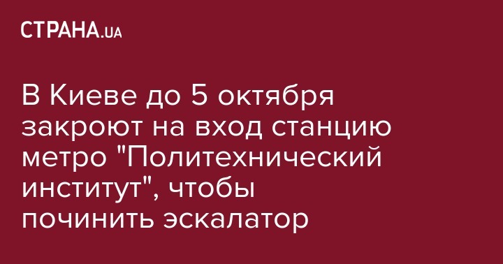 В Киеве с 24 сентября по 5 октября будет закрыта на вход станция метро "Политехнический институт" из-за необходимости ремонта эскалатора. Об этом сообщает столичный метрополитен в своем микроблоге в Twitter.