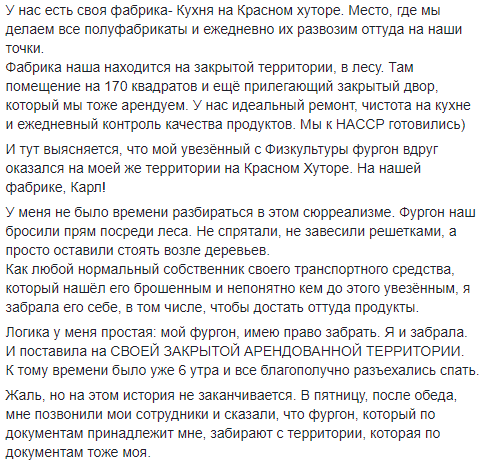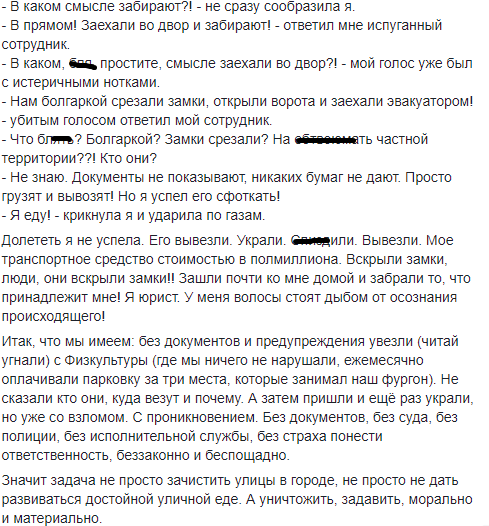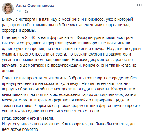 Известно, что транспорт использовался для торговли фаст-фудом на улицах Киева. Вечером фургон Furgonetta находился на платной парковке на улице Физкультурной. Инцидент произошел в четверг, 13 сентября. Поздно ночью трое неизвестных мужчин проникли в фургон Овсянниковой и без объяснений выбросили на улицу находившегося в нем сотрудника. Транспорт отрезали от электричества, погрузили на эвакуатор и увезли в неизвестном направлении.