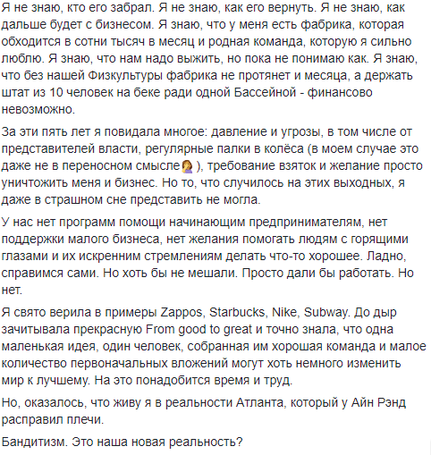 "У нас нет программ помощи начинающим предпринимателям, нет поддержки малого бизнеса, нет желания помогать людям с горящими глазами и их искренним стремлениям делать что-то хорошее. Я свято верила в примеры Zappos, Starbucks, Nike, Subway. До дыр зачитывала прекрасную From good to great и точно знала, что одна маленькая идея, один человек, собранная им хорошая команда и малое количество первоначальных вложений могут хоть немного изменить мир к лучшему. На это понадобится время и труд. Но, оказалось, что живу я в реальности Атланта, который у Айн Рэнд расправил плечи. Бандитизм. Это наша новая реальность?" - пишет жертва кражи Овсянникова.