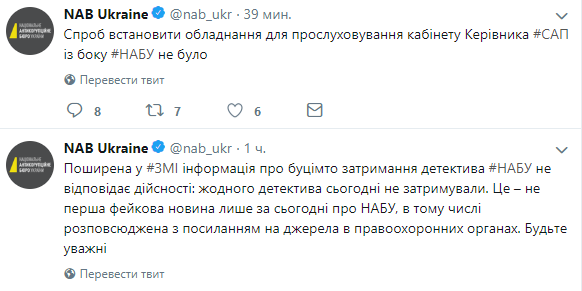 Информация о якобы задержании детективов бюро также является фейком, по мнению представителей НАБУ.