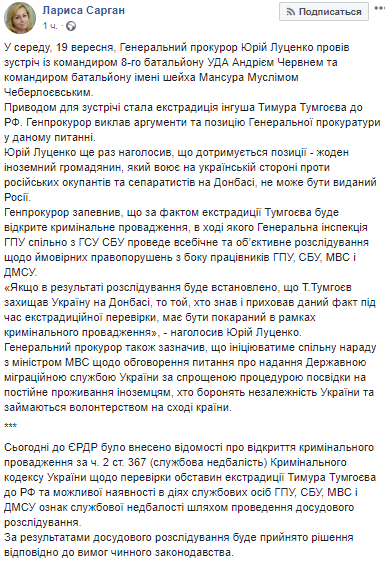 Также пост Ларисы Сарган был допорлнен информацией о том, что 20 сентября было открыто уголовное производство относительно проверки обстоятельств экстрадиции Тимура Тумгоева в РФ и возможного наличия в действиях должностных лиц ГПУ, СБУ, МВД и ГТСУ признаков служебной халатности путем проведения досудебного расследования.