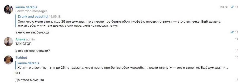 "Что с меня взять, я до 25 лет думала, что в песне про белые обои "кофеек, плюшки стынут" – это о выпечке. Еще думала, ***** [ничего] себе, у них там драма, а они параллельно плюшки пекут", – написала одна из участниц диалога.