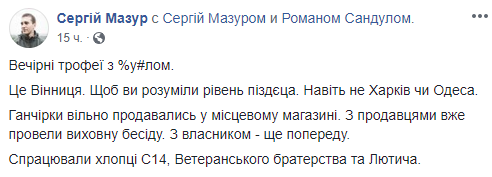"Это Винница. Чтобы вы понимали уровень пи***ца. Даже не Харьков или Одесса. Тряпки свободно продавались в местном магазине. С продавцами уже провели воспитательную беседу. С владельцем - еще впереди", – сказано в сообщении.