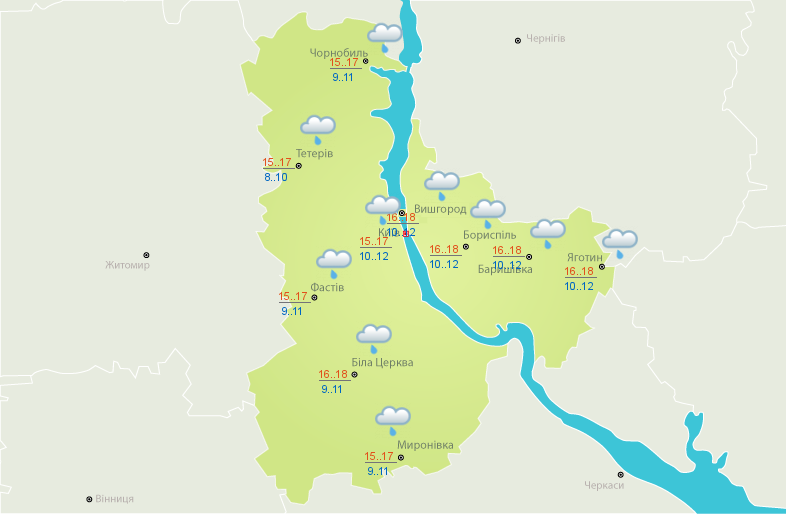 Впрочем, дожди с грозами пройдут не только в Киеве, но и в других регионах страны. Так, облачная с прояснениями погода ожидается только в некоторых областях Западной Украины: в Закарпатской, Львовской, Ивано-Франковской областях, а также на Буковине и Тернопольщине. В других западных областях прогнозируются дожди. При этом во всех населенных пунктах этого региона ожидается похолодание до +16...+18 °C.