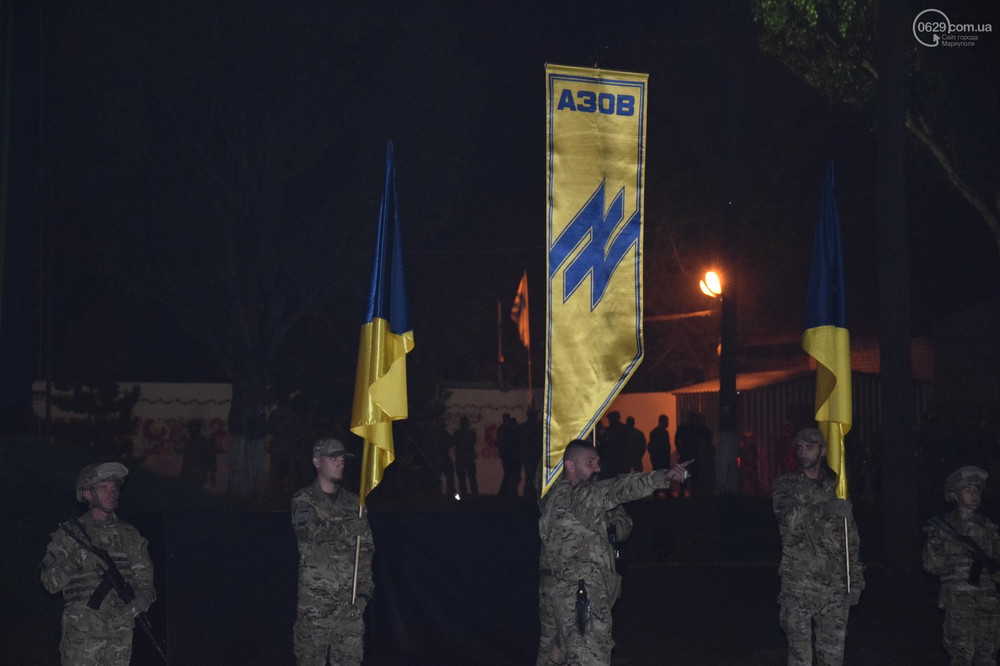 Была разыграна настоящая мистерия. Все подразделения полка выстроились на поле под своими штандартами, затем при свет факелов прошла молитва украинского националиста. Под эпическую музыку вышла щитоносная группа. На каждом из 35 щитов был написан позывной погибшего добровольца. Особенность церемонии в этом году состояла в том, что вспоминали не только погибших в боях азовцев, но и тех, кто служил в полку ранее, а после перешел в другие батальоны и был убит на Донбассе. Вспоминали и азовцев, погибших в результате несчастных случаев.