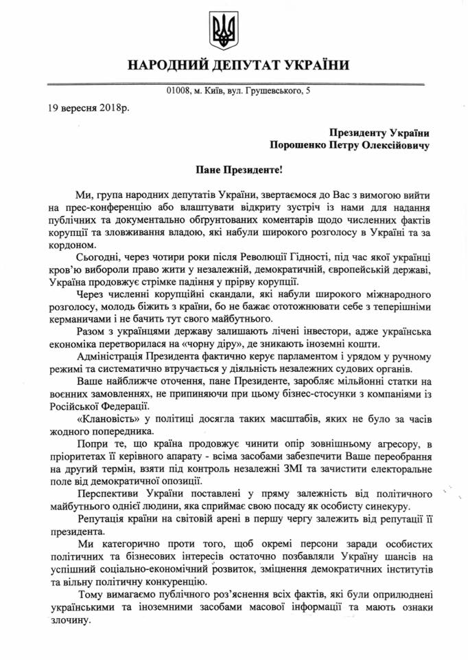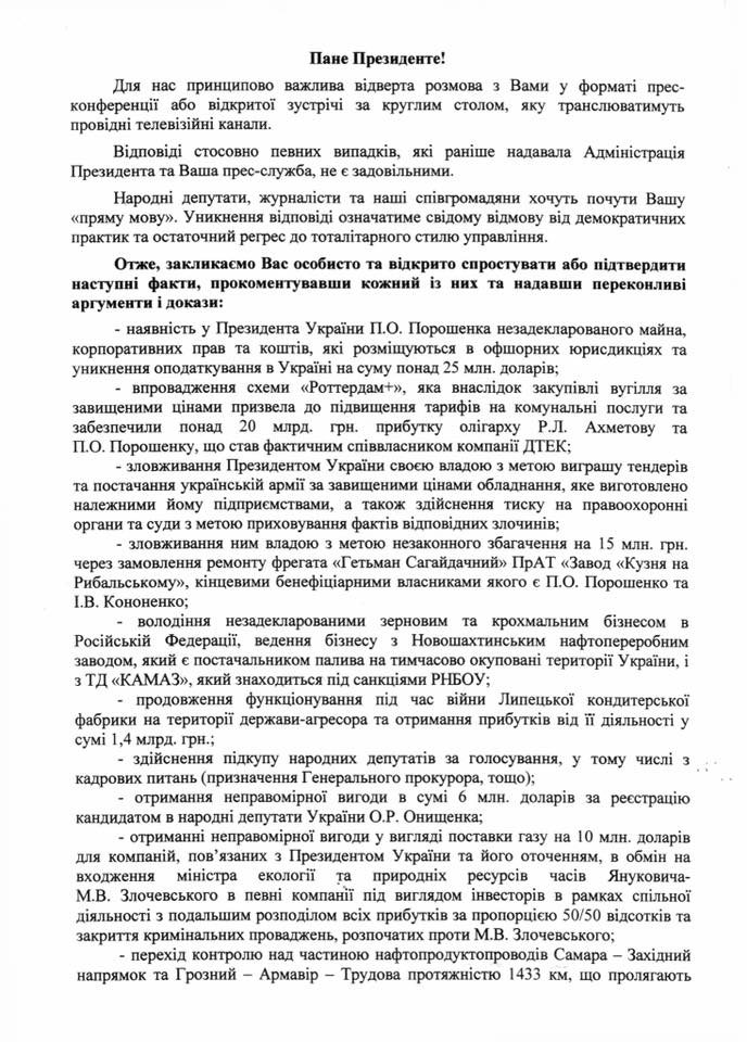 Нардеп также опубликовал копии письма и подписей. Члены парламента просят главу государства выйти на пресс-конференцию либо организовать открытую встречу с народными депутатами. Они призывают Петра Порошенко лично подтвердить или опровергнуть информацию о наличии у Порошенко незадекларированного имущества, корпоративных прав и средств в офшорных юрисдикциях и уклонении от налогообложения в Украине.