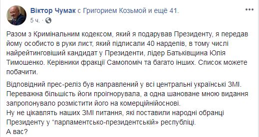"Вместе с Уголовным кодексом, который я подарил президенту, я передал ему лично в руки письмо, которое подписали 40 нардепов, в том числе самый рейтинговый кандидат в президенты, лидер "Батькивщины" Юлия Тимошенко", - написал нардеп.