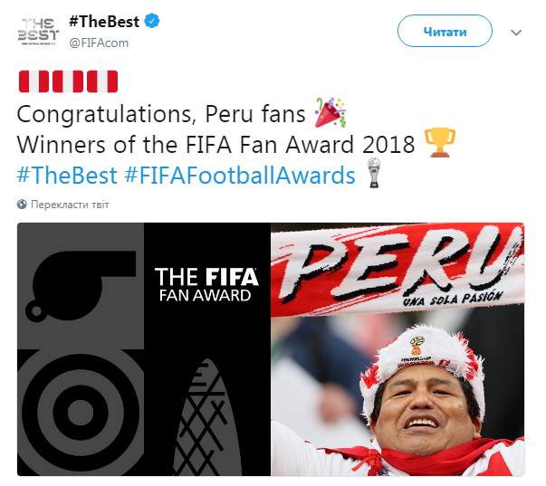 В понедельник, 24 сентября, в Лондоне на церемонии The Best FIFA Football Awards, лучшими футбольными болельщиками сезона признаны любители футбола из Перу.