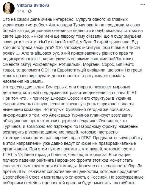 "Интересны две вещи. Во-первых, она открыто называет мировых деятелей, которые поддерживают развитие движения за права ЛГБТ. При том что, к примеру, Джордж Сорос и его структуры в Украине сыграли очень важную , если не ключевую роль в приходе к власти нынешней команды. Во-вторых, буквально сегодня же появилась информация о том, что Александр Турчинов планирует возглавить объединение протестантских церквей в Украине.