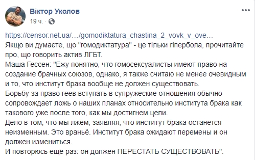 При этом нужно понимать, что людей, которые против ЛГБТ, в Украине гораздо больше, чем тех, которые за. В ситуации полного падения рейтинга Народного фронта этот ход может стать спасительным кругом для их команды. Конечно есть сложность: борьба против ЛГБТ означает сопротивление ценностям, которые продвигает Европейский Союз и ментальную близость с Россией. Но возбуждённые поборники семейных ценностей вряд ли будут мыслить так глубоко".