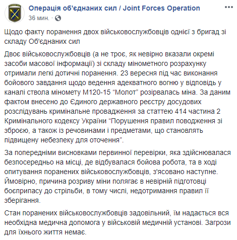 "Двое военнослужащих (а не трое, как было указано в СМИ) из состава минометного расчета получили легкие касательные ранения. 23 сентября во время выполнения боевого задания по ведению адекватного ответного огня в канале ствола миномета М120-15 "Молот" разорвалась мина", - говорится в сообщении.