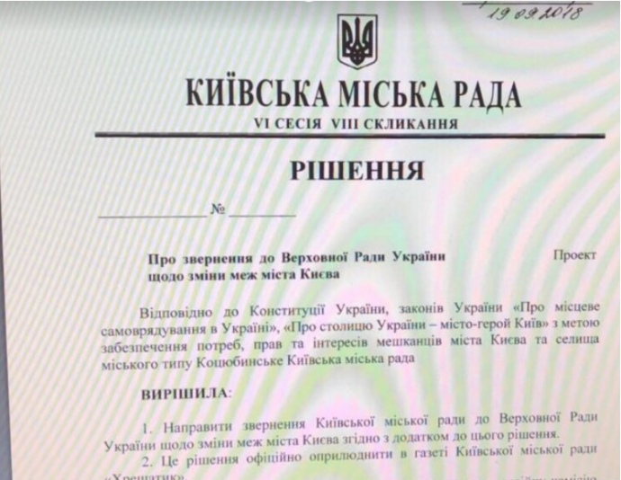 27 сентября Киевсовет может рассмотреть вопрос, который инициировала община Коцюбинского о присоединении к Киеву. Об этом сообщает общественное движение ЧЕСНО.