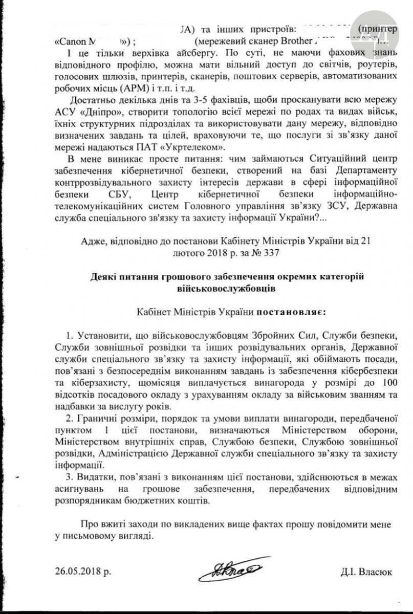 Также Власюк получил 5 июля 2018 года ответ от Департамента контрразведывательной защиты интересов государства в сфере информационной защиты СБУ, согласно которому, все нарушения доступа в сети АСУ "Дніпро" устранены.
