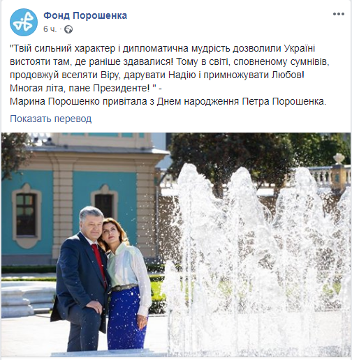 26 сентября Марина Порошенко поздравила мужа с днем рождения публично - на странице "Фонд Порошенко" в Facebook.