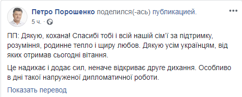 Сам Петр Порошенко не остался в долгу у супруги и ответил на ее поздравление так же публично - на своей странице. Он поблагодарил жену, а заодно и всех поздравивших его украинцев. Кроме того, Петр Порошенко похвастался, что сейчас он ведет "напряженную дипломатическую работу".