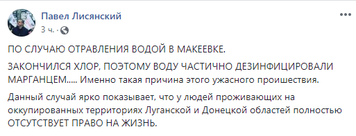"По случаю отравления водой в Макеевке. Закончился хлор, поэтому воду частично дезинфицировали марганцем..... Именно такая причина этого ужасного происшествия", - написал Лисянский на своей странице в соцсети Facebook.