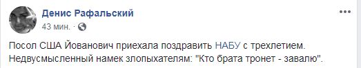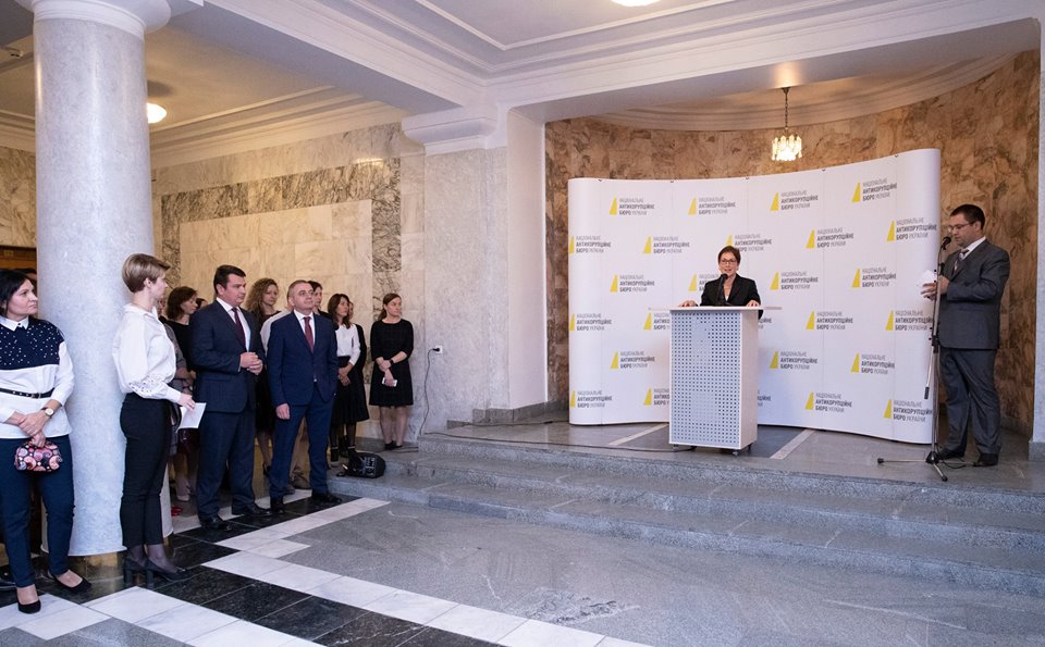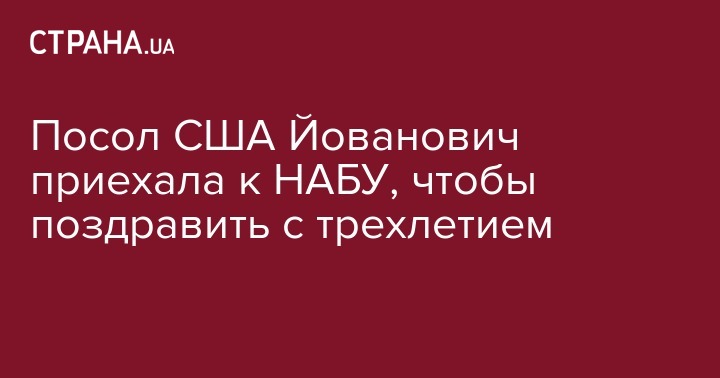 Посол США Мари Йованович 27 сентября приехала поздравить Национальное антикоррупционное бюро Украины (НАБУ) с трехлетием создания. Об этом посольство написало на своей странице в Twitter.