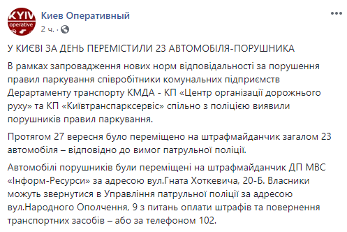 Вчера в Киеве, 27 сентября, в первый день действия нового закона, 23 автомобиля, владельцы которых нарушили правила парковки, эвакуировали на штрафплощадку. Об этом сообщает "Киев Оперативный" в Facebook.