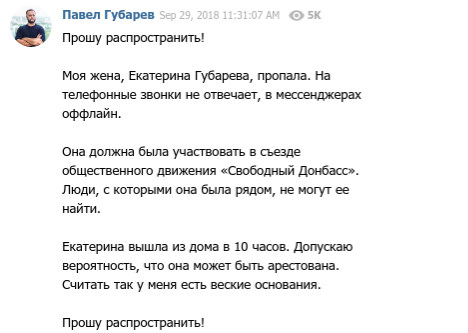 Также сепаратист Павел Губарев, который выдвинул свою кандидатуру на "выборах" главы "ДНР", написал в соцсетях, что пропала его жена Екатерина. Он отметил, что его жена должна была участвовать в съезде "Свободного Донбасса".