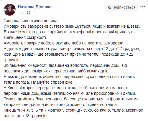 Что касается столицы, до четверга тут будет прохладно и дождливо, а вот 5-7 октября в Киев придет солнце, а температура будет подниматься до +18 градусов.