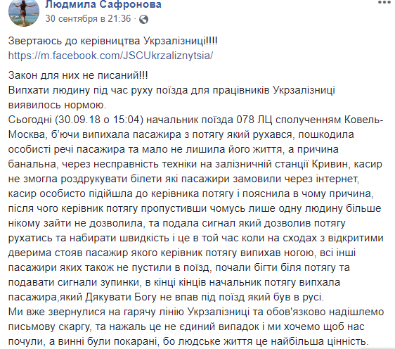 В поезде из города Ковеля в Москву пассажиров вытолкали из вагона из-за отсутствия распечатанных билетов, когда состав уже начал движение. Об этом сообщила одна из пассажирок Людмила Сафронова в Facebook.