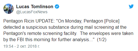 "По меньшей мере две посылки, предположительно содержащие рицин, были отправлены в Пентагон", - говорится в сообщении.
