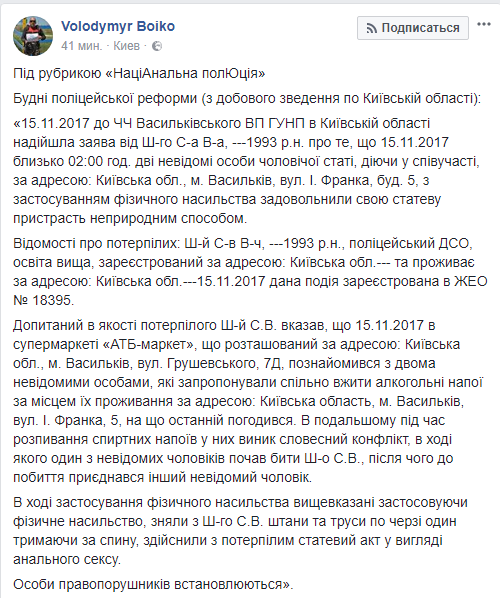 Эта история восходит к событиям, развернувшимся 15 ноября 2017 года в доме на улице Ивана Франко (ранее - переулок Коммунальный) города Василькова Киевской области. В дежурную часть управления полиции обратился полицейский Печерского райотдела Государственной службы охраны Станислав Шумский с заявлением об изнасиловании его двумя мужчинами.