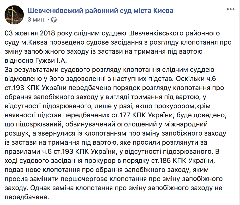 3 октября Шевченковский районный суд города Киева отказал прокуратуре в изменении меры пресечения главреду "Страны" Игорю Гужвы и взятии его под стражу.