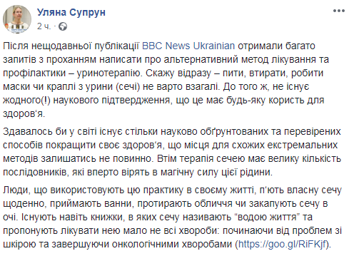 В Министерстве здравоохранения Украины получили большое количество запросов с просьбой уточнить информацию об уринотерапии. Ответить на них решилась глава ведомства Уляна Супрун. Она призвала людей не употреблять ни свою, ни чужую мочу никак и ни в каком виде.