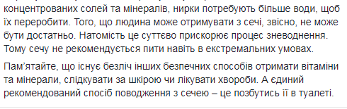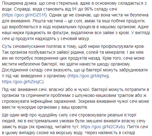 "Еще один миф о чудодейственной силе мочи спровоцировали реальные истории людей, которые в экстремальных условиях были вынуждены принимать собственную мочу вместо воды (как пример, читайте здесь: https://goo.gl/N2CXvb). Питья мочи в этом случае похоже на морскую воду. Из-за наличия в составе концентрированных солей и минералов, почки нуждаются больше воды, чтобы их переделать. Того, что человек может получать из мочи, конечно, не может быть достаточно. В свою очередь это существенно ускоряет процесс обезвоживания. Поэтому мочу не рекомендуется пить даже в экстремальных условиях", - написала она.