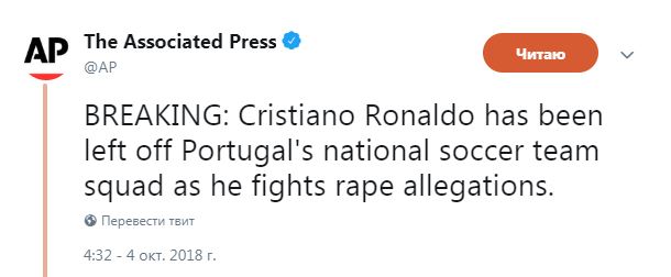 После обвинений в изнасиловании знаменитого нападающего сборной Португалии Криштиану Роналду отстранили от участия в матчах за национальную сборную по футболу. Об этом сообщает AP в Twitter. Роналду отстранен от участия во всех матчах команды во время осеннего сезона, заявил тренер сборной Португалии.