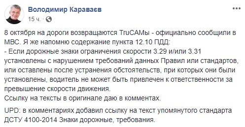 "Если дорожные знаки ограничения скорости 3.29 и/или 3.31 установлены с нарушением требований данных Правил или стандартов, или оставлены после устранения обстоятельств, при которых они были установлены, водитель не может быть привлечен к ответственности за превышение скорости движения" - пишет об этом Караваев.