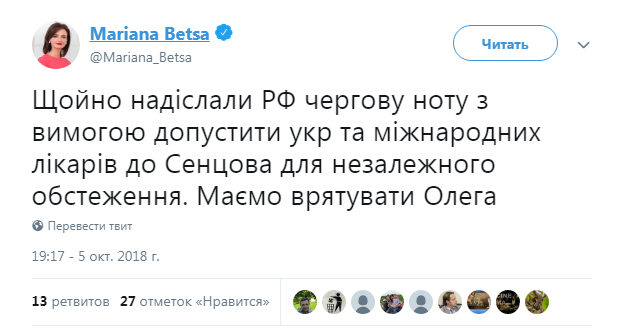Украина направила ноту в МИД РФ по вопросу украинского режиссера и политзаключенного Олега Сенцова, который прекратил голодовку в связи с тем, что к нему должны были применить принудительное питание. Об этом написала в Twitter пресс-секретарь МИД Марьяна Беца.