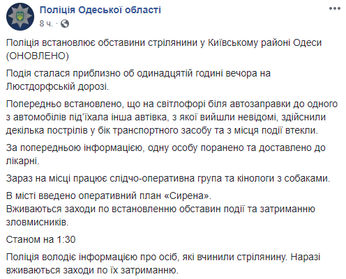 В ночь на 7 октября в Одессе произошла стрельба с пострадавшими. Об этом в Facebook сообщает Нацполиция Одесской области.