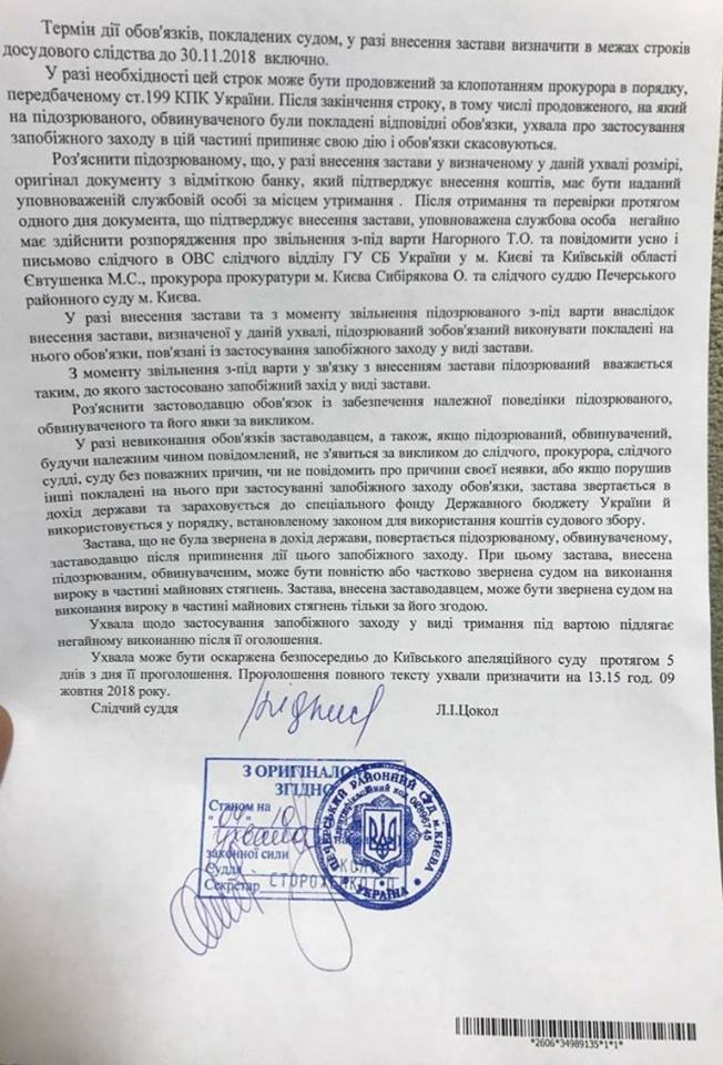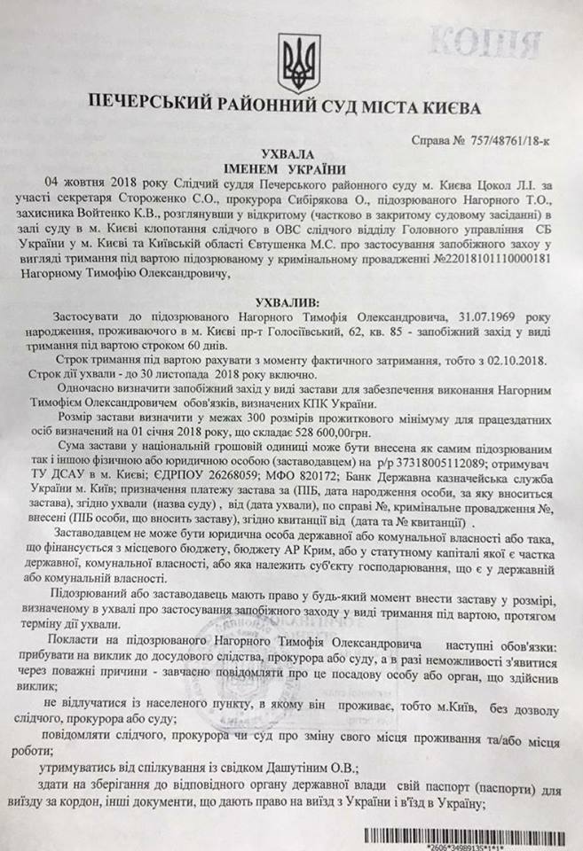 Он также приводит текст решения суда о мере пресечения для Нагорного. Печерский суд Киева 4 октября избрал ему содержание под стражей с правом выйти под залог 528 600 грн.