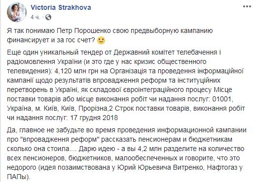 В соцсетях расценили эту закупку как то, что Порошенко хочет провести свою рекламную кампанию за государственный счет. "Да, главное не забудьте во время проведения информационной кампании про "впровадження реформ" рассказать пенсионерам и бюджетникам сколько она стоила.... Дарю идею - а вы 4,2 млн разделите на количество всех пенсионеров, бюджетников, малообеспеченных и говорите, что это недорого (идея позаимствована у Юрий Юрьевича Витренко, Нафтогаз у ПАПы)", - пишет в Facebook Виктория Страхова.