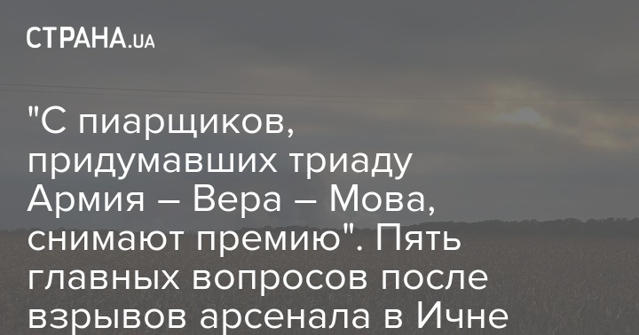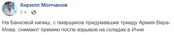 "На Банковой кипиш, с пиарщиков, придумавших триаду "Армия – Вера – Мова", снимают премию после взрывов на складах в Ичне", – пишет политолог Кирилл Молчанов.