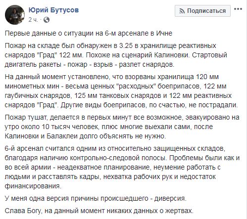 "Пожар на складе был обнаружен в 03.25 в хранилище реактивных снарядов "Град" 122 мм. Похоже на сценарий Калиновки. Стартовый двигатель ракеты – пожар – взрыв – разлет снарядов", – написал Бутусов.